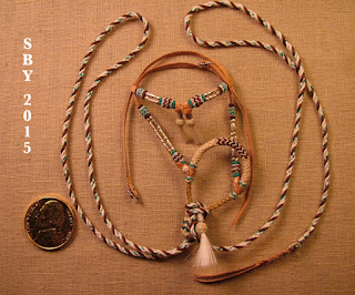 This is a good view of the 'braided-and-wrapped' approach of the pure-rawhide (central) parts of the breastcollar. The buttons were formed from 3-strand-braided sinew, then cut in short sections and wrapped around the lace, and glued down. This method gives a fine appearance of scale-model braided rawhide, and is mentioned in my Guide. But TSII tack doesn't use it...
