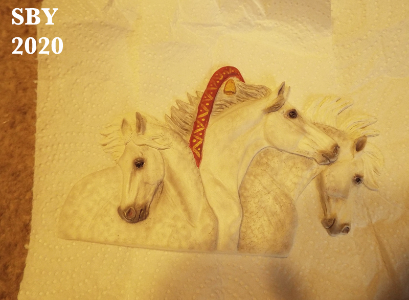 If I am stuck and can't move, this is a good place to start budging. NOW is the time to repair Brasenose and (almost in the same breath) to repaint Alzucar/Rocket. Give that dishwater-doeskin some real black points and a golden metallic body overlay: here, at least, is a color not roan! Here is a 6th horse, a Teke still, and connected to your standing-Russian-horse habit,... but easier. In theory.