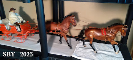 These display photos were taken by my cell phone. Above: a heavily-customized-by-me sleigh that started life as a green bobsleigh by Dick Eighmey. Below: My Grand Champion of Show horse and harness (circa 2000) put to a Dave Blenkey Draft Cart (1999). Doll by Anne Field.