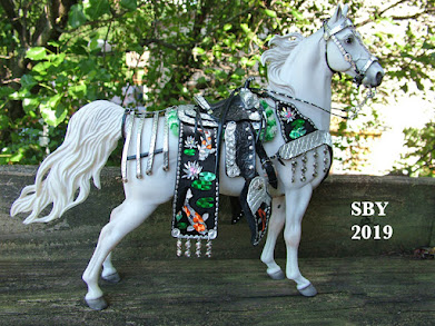 TSII #427, Mint Chocolate Chip set, was built in 2002 for Val Sydor. [Reserve has been met.] More pictures, and descriptions from my Grey Braidwork scrapbook and the TSII Saddle Numbers Registry, here. Don't miss this delicious example of model tack artistry! Closes Thurs. July 11 at 8pm.